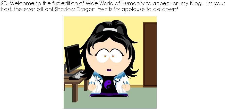 Reason for making this blog: Honestly, it was mainly just to have a place to update the status of my stories. Thus forcing me to actually work on them rather than getting distrac... of look, something shiny. I'll also talk about various news topics that pique my interest and about GLBT issues (since I'm a transgendered bisexual, they kinda affect me). Also, I going to have a weekly comic called, The Wide World of Humanity, in which I poke fun at people.